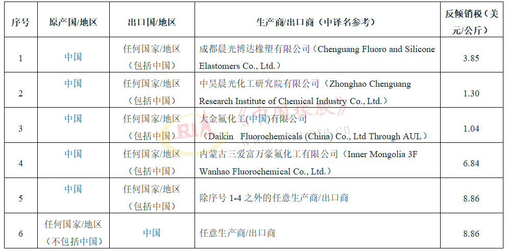 印度對(duì)華氟橡膠日落復(fù)審終裁征稅表