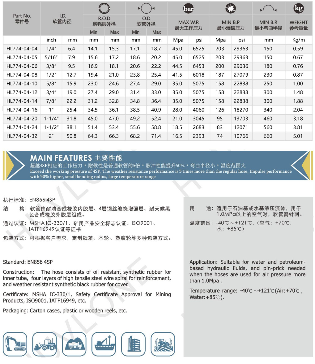 Meet/Exceed DIN EN856 4SP Four steel wires spiral rubber hydraulic hose