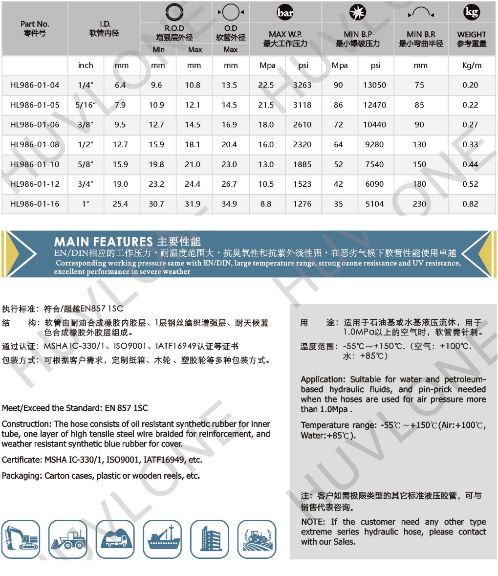 Meet/Exceed the standard of DIN EN857 One steel wire braided Rubber hydraulic hose with high & Low temperature - resistance