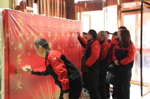 公司全體員工簽到進(jìn)入會(huì)場(chǎng)。