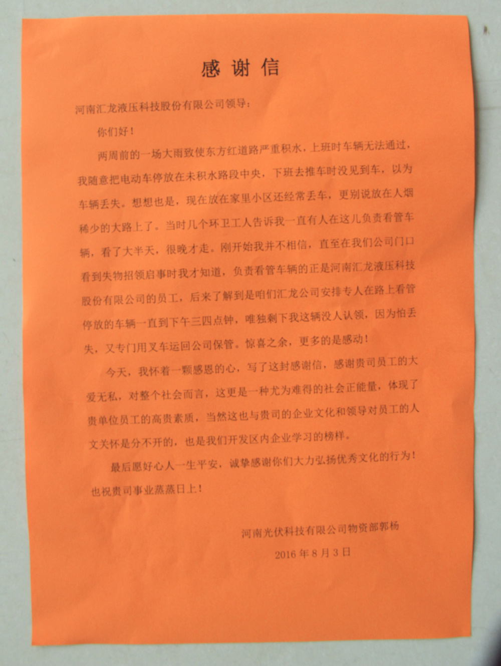 8月2日,協(xié)鑫的兩名員工來(lái)到我公司認(rèn)領(lǐng)電動(dòng)車(chē),電動(dòng)車(chē)主人為協(xié)鑫物資部郭楊,郭楊說(shuō),她幾乎已經(jīng)放棄了尋找電動(dòng)車(chē)的希望,并把電動(dòng)車(chē)防盜鎖的鑰匙都給扔了。8月3日上午,我公司設(shè)備部員工幫忙將電動(dòng)車(chē)的鎖打開(kāi),郭楊高高興興地推走了電動(dòng)車(chē)。下午,郭楊又同協(xié)鑫行政部、供應(yīng)部、采購(gòu)部的幾名人員前來(lái)我公司進(jìn)行感謝,并帶來(lái)了一封感謝信。