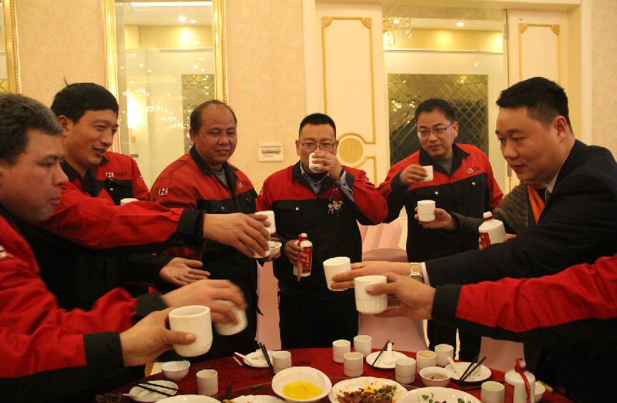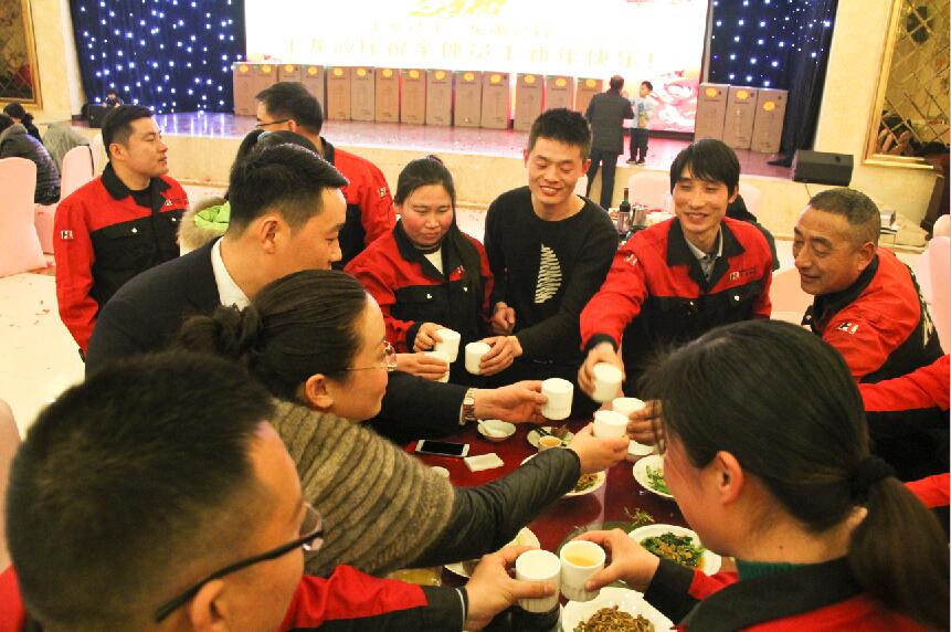 席間,董事長帶領(lǐng)著部門領(lǐng)導(dǎo)來到餐桌前對全體員工表達感謝和祝福。