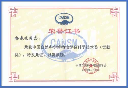 2019年2月25日,中國(guó)自然科學(xué)博物館學(xué)會(huì)第七次全國(guó)會(huì)員代表大會(huì)在北京召開。會(huì)議對(duì)全國(guó)會(huì)員在科學(xué)技術(shù)工作中做出突出貢獻(xiàn)的108人進(jìn)行了表彰,我公司楊春岐楊總榮獲“中國(guó)自然科學(xué)博物館學(xué)會(huì)科學(xué)技術(shù)獎(jiǎng)(貢獻(xiàn)獎(jiǎng))”。據(jù)悉,“中國(guó)自然博物館學(xué)會(huì)科學(xué)技術(shù)獎(jiǎng)”每屆(五年)頒發(fā)一次,用于表彰各屆理事會(huì)期間為科博學(xué)會(huì)事業(yè)發(fā)展作出突出貢獻(xiàn)的個(gè)人會(huì)員。